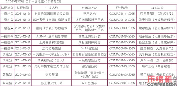 中國通用機械工業(yè)協(xié)會(CGMIA)發(fā)布的壓縮空氣站認證公示數(shù)據(jù)顯示,2025年8月-2026年1月共公示27個認證案例,其中一級能效22個、領先型5個,覆蓋12個省份/直轄市,工業(yè)密集區(qū)(長三角、珠三角)占比超60%。這為我們分析未來空壓機站的發(fā)展趨勢提供了重要依據(jù)。